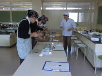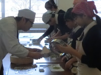 天狗橋のたもとにある「廣野菓子店」店主の廣野純一氏に来ていただき、和菓子講習会を実施しました「松の雪」と「紅梅」という1月らしい練り切りに挑戦し、切りぼかし、さじ切りと言った技法を学びました。和菓子消費量日本一の石川県の食文化に触れた授業でした。