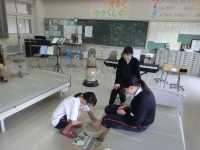 今日も福寿園から介護福祉士の紺谷さんを招いて介護技術の実技演習を行いました。内容は入浴介助で、入浴のできない高齢者に対して行う清拭や手浴、足浴について学習し、実際に2人ペアで足浴を行いました。慣れるまでは洗われる方はくすぐったかったりして大変そうでしたが、最後はどの生徒も丁寧に足浴を行うことができました。