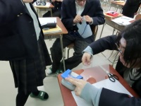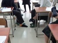 今日は介護福祉基礎の授業で金城大学の猪狩もとみ先生を招いてソックスエイドという靴下を履くための自助具を作りました。リサイクル品(使用済みファイルの表紙)やひもを用いて簡単に作れ、楽な力で靴下を履くことができたことに感動している生徒もいました。他にも理学療法士と作業療法士の違いなども説明していただき、今までなんとなく教科書でさらった知識が体験を伴って身についていく様子が伺えました。