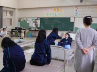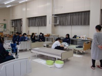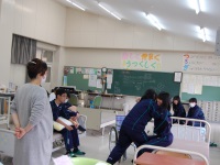 今週金曜日と来週月曜日の1日介護実習に向けて、今年度最後の南ケアセンターの中島さんによる授業が行われ、今までに習った介護技術の復習を行いました。各グループごとに指定された介護技術を実践していくのですが、忘れている部分も多く苦戦している姿が見られました。しかし、今回一通り復習することで、実習前に大切なポイントを確認することができてよかったです。
