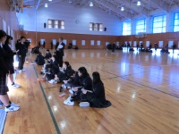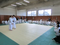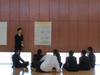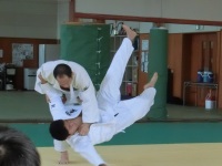 実技指導では、柔道部と他の部活動に分かれて、大外刈りなど基本的な技術について教えていただきました。また、実演として岡田先生の得意技である小内刈りも披露いただきました。