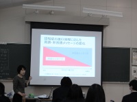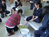 今日は金城大学看護学部から久米真代先生にお越しいただき、認知症の人とのコミュニケーションについてお話していただきました。人を理解するということは主張を受け入れるということよりも言葉を受け取ってくれた感触の方が大切だということと、また、ただ受け入れるだけでは聞き流しているととらえられている可能性があるので、受け入れたうえで自分の意見を述べることの必要性も学ぶことができました。来週から始まる介護老人福祉施設での1日実習にぜひ生かしていきたいと思います。
