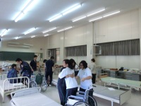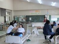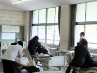 今日も金沢南ケアセンターから介護職員の中島さんにおいでいただき、トイレ誘導を中心とした介助の仕方を実習しました。3人一組で利用者役1人、介助者役2人分かれて移乗を担当する人、着脱などのトイレ介助を担当する人、利用者役とローテーションしながら実演しました。1回習っているはずの移乗ですが、戸惑っている生徒も多く見受けられました。それでもお互いに相手のやり方にアドバイスをしながら楽しく活動していました。