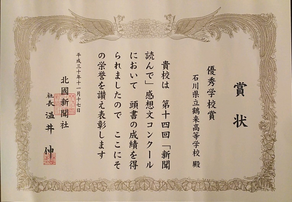 2018年11月17日 18時22分11月17日(土)午前11時より、北國新聞会館で北國新聞社主催の「新聞読んで」感想文コンクールの表彰式が行われました。鶴来高校はおかげさまで優秀学校賞をいただくことができました。生徒たちには新聞を読み、自ら考えることで、社会や地域に関心を持ってもらいたいと願っています。