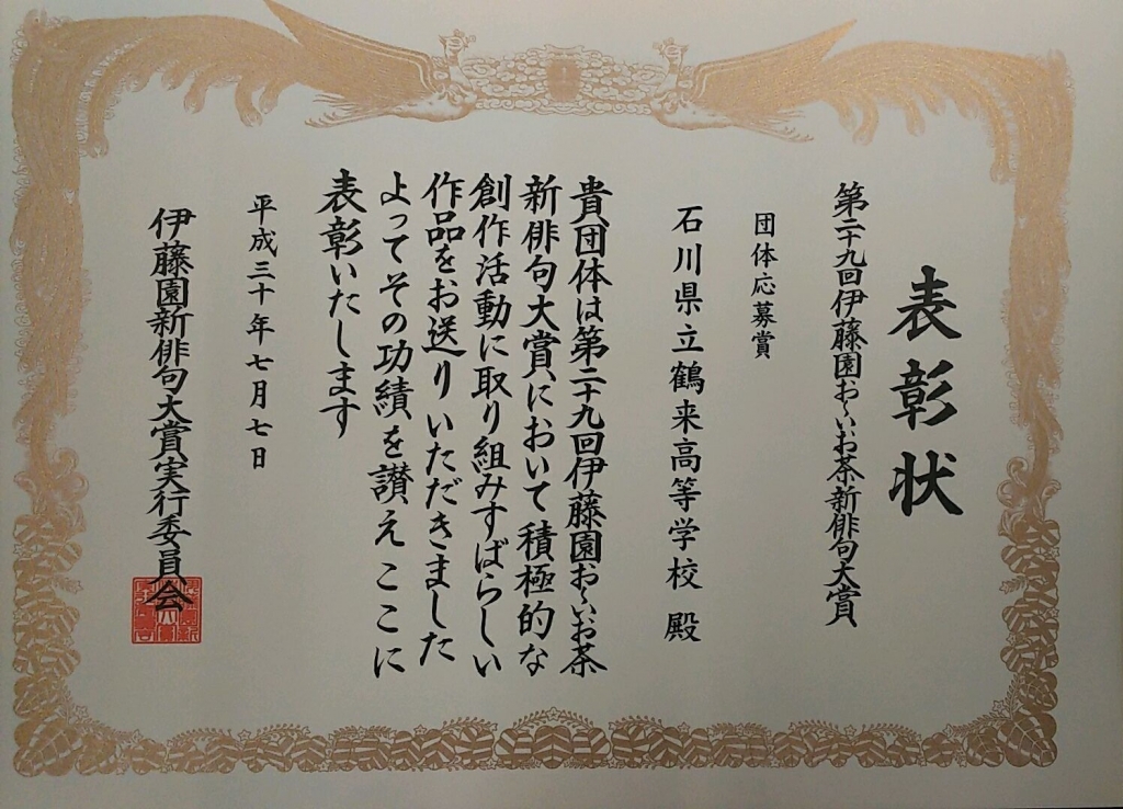 9月14日、伊藤園小松支店長の佐藤様が鶴来高校を訪問され、第29回お~いお茶新俳句大賞団体応募賞を贈呈されました。国語の時間に創作した俳句に対していただいたものです。鶴来高校では今後も俳句を始めとした文芸に親しむ活動を続けていきたいと思っています。