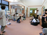 今年度2回目となる児童館実習へ行ってきました。はじめにきらきら星を振り付きで歌った後、ぶんぶんぶん、かたつむり、やぎさんゆうびん、犬のおまわりさんを歌いながら踊ったりペープサートをしたりしました。今回は伴奏もすべて生徒で担当し、細かいミスはありながらも曲が止まることはなく、すべてやりきることができました。また、最後にトーンチャイムでおもちゃのチャチャチャとさんぽを歌いながら演奏しました。お客さんは保護者と子ども3組計7人で、子どもも小さかったですが、一緒に楽しんで歌ったり踊ったりしてくれて、生徒も喜んでいました。