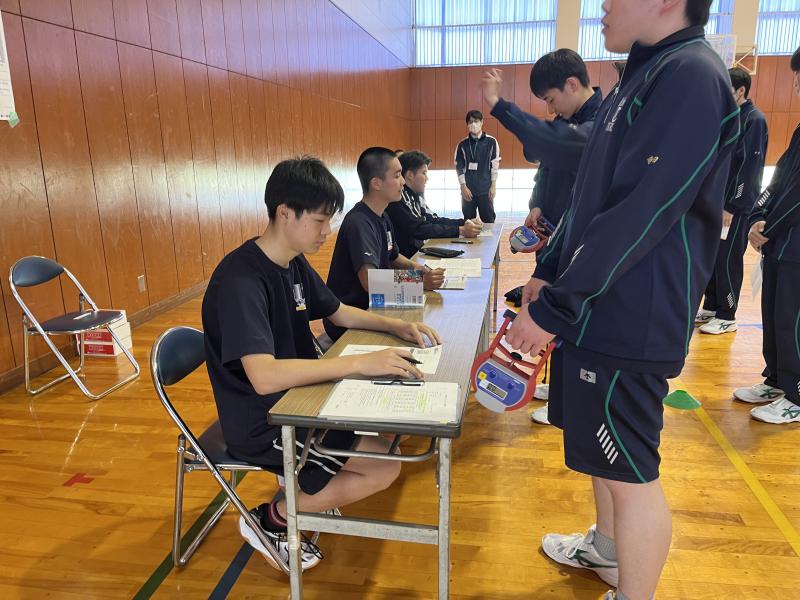 生徒はハンドボール投げ、立ち幅跳び、上体起こし、長座体前屈、握力、反復横跳びの6つの種目を、力の限り取り組んでいました。