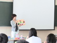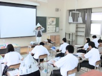 2年生の社会福祉基礎の授業では、現在子ども家庭福祉について学習していますが、その一環として今日は県の「福祉の伝道師」という事業を利用して、小松市の「認定こども園ひかりっこ」より麻田祐子先生にお越しいただき、楽しい保育の世界について講義していただきました。かわいい子どもたちの写真を中心に保育園の様子や保育士のやりがいなどをお話しいただいた後、生徒たちは実際に保育者になったつもりで新聞紙を使ったお話を作ったり、発達段階に応じた手作りおもちゃに触れたりしていました。