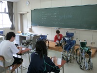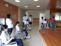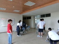 今日は金沢南ケアセンターの中島さんに再びお越しいただき、2回目となる介護技術の実技講習会が行われました。テーマは「車椅子」です。はじめに車椅子の各部名称を確認した後安全チェックや折り畳みの方法などを実際にやってみました。それから実際に交代で乗ってみて押すときの注意や段差、坂道での介助方法を学びました。