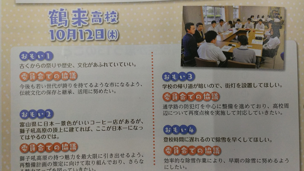 2月15日、白山市議会より山口俊哉広報広聴委員長ら3名が、議会だより51号を本校に届けて下さいました。昨年10月に本校で行われた議会報告会の模様が掲載されているものです。本校生の意見やそれに関連する委員会での協議事項が載っています。鶴来高校は白山市の発展のために今後もできることで貢献していきたいと考えています。
