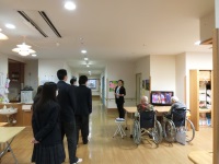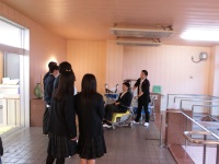 今日は「社会福祉基礎」を選択している2先生が、午後から「あじさいの郷」へ施設見学に行ってきました。講師として時折授業にいらっしゃってくれる施設長の供田さんから、「あじさいの郷」の概要や介護保険制度のあらましについて説明していただいた後、2グループに分かれて「あじさいの郷」の中をいろいろと案内していただきました。生徒が特に驚いていたのはお風呂場で、車椅子のまま入れる浴槽の仕掛けに興味津々でした。お忙しい中温かく生徒を迎えてくださった供田さんをはじめとした職員や利用者の皆さん、本当にありがとうございました。