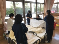 「介護福祉基礎」を選択している生徒が「あじさいの郷」で 1日介護実習を行いました。8時半に施設に集合した後、施設長の供田さんから施設の実習の注意事項を説明していただきました。特に挨拶と声かけが大事で、それさえできればどこへ行っても通用するとお話ししてくださいました。その後通所介護(デイサービス)の方へ入り、シーツ交換や入浴後の介助、食事の配膳などを行い、昼休憩をはさんでからはレクリエーションに参加しました。