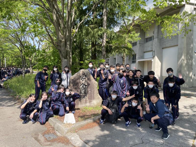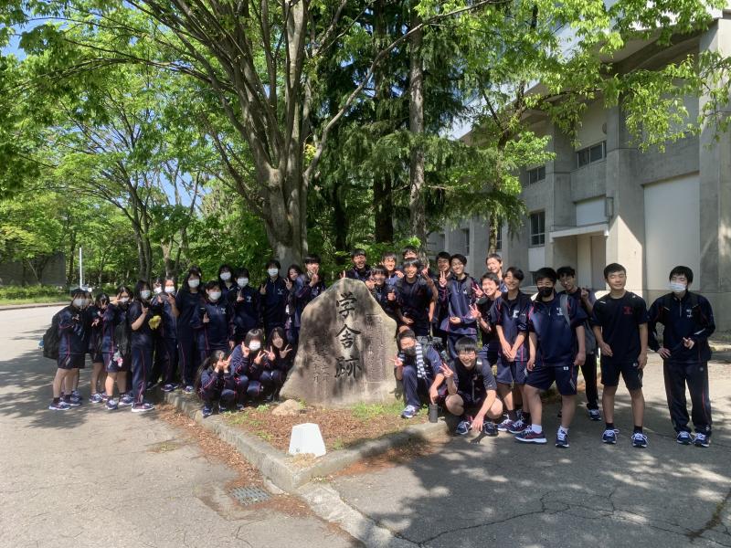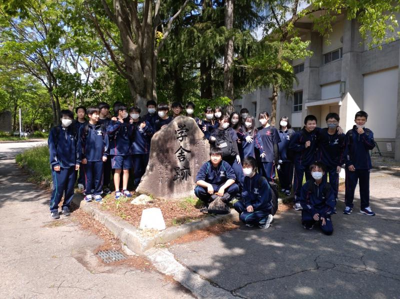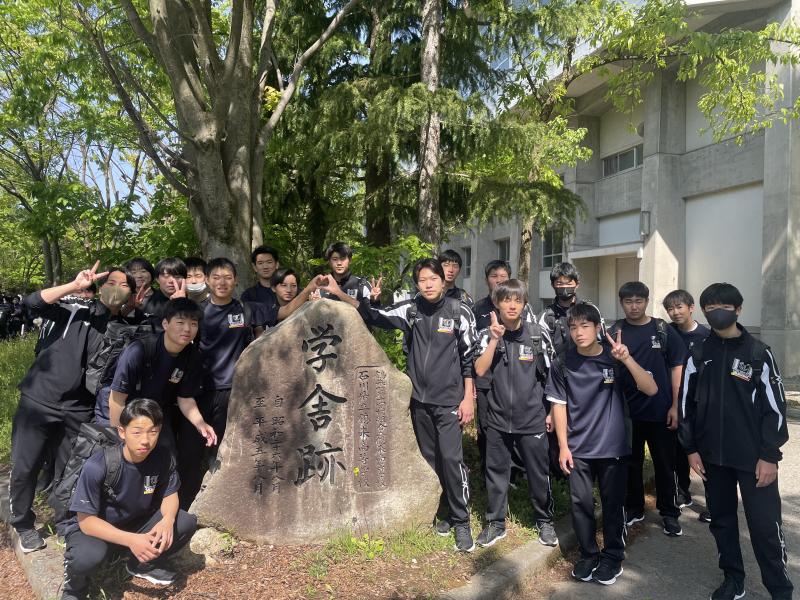(↓各クラス鶴来旧校舎跡地石碑前にて集合写真)