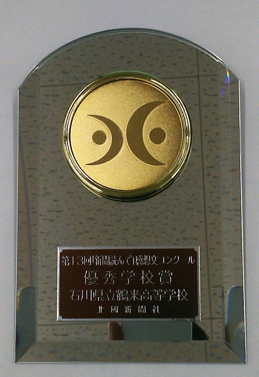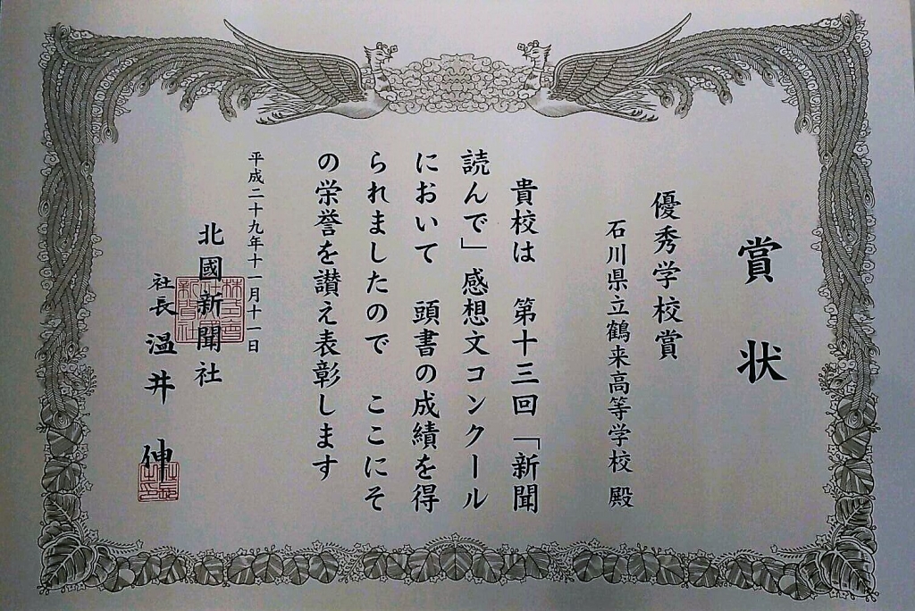 11月11日(土)午前11時より北國新聞社にて、「新聞読んで」感想文コンクール表彰式が行われました。鶴来高校からは1年生の辻沙耶佳さんが「佳作」で入賞、鶴来高校も優秀学校賞を受賞しました。温井社長のご挨拶に続き、代表者への賞状の授与、田中石川県教育長、野口金沢市教育長の祝辞、青山金沢学院大学学長の講評と激励と、厳かな雰囲気での表彰式でした。鶴来高校では、読書や新聞に親しむ活動を今後も続けていきます。写真は優秀学校賞の盾と賞状です。
