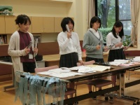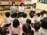 今日は3回目となる児童館実習でした。あいにくの雨でお客さんがいるかどうか不安でしたが、川北町の保育園から遠足で3・4歳児の子どもたちがちょうど遊びに来てくれていたので、大勢のお客さんの前で発表することができました。一人発熱で欠席したため、プログラムが変更された部分もありましたが、最後の「夢をかなえてドラえもん」の演奏ではたくさんの子どもたちが一緒に歌ってくれて、生徒たちも喜んでいました。一緒に手遊びもして盛り上がりました。