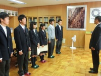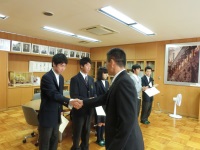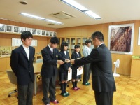 先の生徒会役員選挙で信任を受けた後期生徒会役員の役員任命式が、校長室で行われました。校長先生から一人ずつ任命証を受け取り、固い握手を交わした後、「ますます学校がよくなるように盛り上げていってほしい」と激励の言葉をかけていただきました。生徒会長からは「生徒会役員から率先して挨拶をし、学校を盛り上げていきたい」と力強い決意表明がありました。