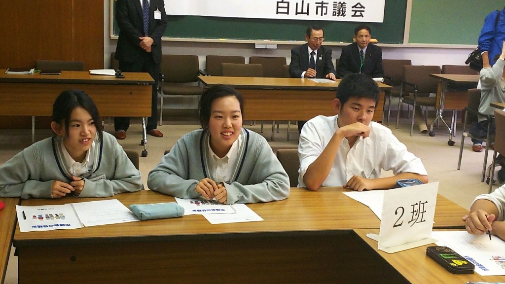 最初、「市議会の仕組みについて」ということで吉本議員より説明がありました。その後、「いいね、白山市!がんばれ白山市!」というテーマで3グループ(各グループ 市議会議員2名、生徒10名)に分かれて話し合いました。話し合いの中では、「白山市活性化のために商業施設を誘致する」、「公共交通を充実させる」等の提案が出されました。また「街灯を明るくしてほしい」「野生動物による被害を抑えてほしい」という要望もありました。