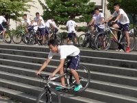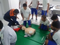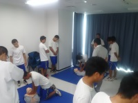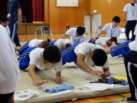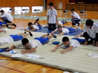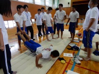 今日のスポ科は、各学年ごとにいろいろな取り組みがありました。1年生は鶴来消防署で救命講習会、2年生は本校体育館で金城大学医療健康学部理学療法学科の永井先生のゼミの方々による研修会、3年生は明和特別支援学校との交流学習でした。