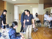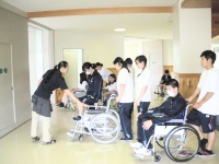 今日の「介護福祉基礎」の授業は、「あじさいの郷」の大竹さんを招いて車椅子の使い方について学びました。開き方やたたみ方、押し方やブレーキの掛け方など基本的な取り扱いを習った後、段差の上がり方や降り方についてラウンジを使って実際に行ってみました。案外力がいる動きに始めは戸惑っている生徒もいましたが、何回も繰り返すうちに全員上手にできるようになりました。