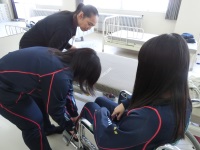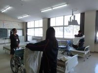 「あじさいの郷」の方を招いての最後の授業となった本日、これまでに習った介護技術を実践形式で復習しました。シーツ交換や着脱介助など、少し忘れているところもあり、実際にやってみるたびに生徒たちは「ああ、そうだった!」と思い出したり、懐かしがったりしていました。
