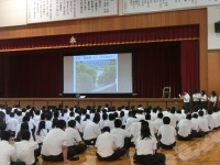 この夏休みに「社会と関わる土曜学習事業」で白山手取川ジオパークについて学習した21Hの生徒が、全校生徒に向けてパワーポイントを使って説明しました。