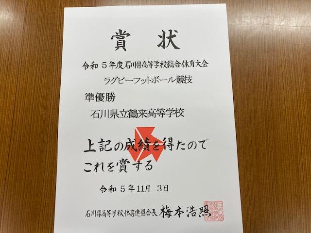 11月3日に開催された石川県高等学校総合体育大会ラグビーフットボール大会で残念ながら、本校ラグビー部は日本航空高校石川に敗れました。しかし、昨年度は完封負けでしたが、今年は1年生の田島君がゴールを決めるなど次に繋がる試合を見せてくれました。また5日に開催された石川県高校駅伝大会にも、年々参加校が減る中、本校は多くの部活動からチーム鶴高で参加しました。選手の皆さん、ご苦労様でした。