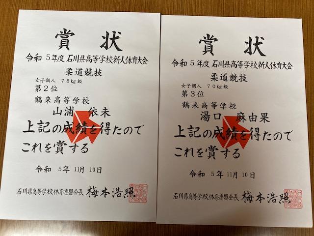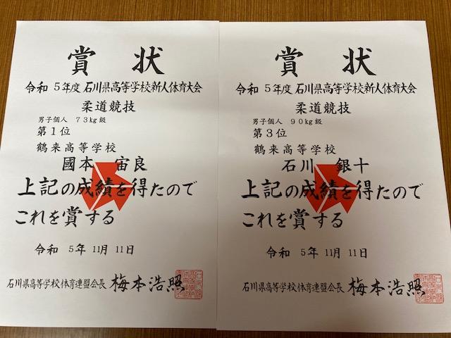 先週開催された新人大会柔道競技男子で本校の國本君(14H)が優勝、石川君(14H)が3位入賞を果たしました。見事団体戦での悔しさを晴らしました。女子では山浦さん(14H)が惜しくも決勝で敗れはしましたが2位、湯口さんも3位と大健闘しました。4人ともまだ1年生です。今後の活躍が楽しみです。