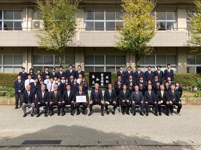創立80周年記念事業の一環として、本校同窓会より校訓碑が贈呈されました。本日12時よりその除幕式が行われました。式には酒井一朗本校同窓会長、山先守夫創立80周年事業実行委員会委員長及び実行委員の皆さん、そして、今回の校訓碑の設立に際しまして、配慮いただきました本校34期卒の村中石材店社長村中勉さんに参加いただきました。最後はお礼も込めて、本校部活動有志及び31Hの生徒の皆さんが大きな声で校歌を合唱してくれました。「質実剛健」「和」「自立」の文字がくっきりと浮かび上がり、私も感動しました。実行委員の皆さん、大きな声で歌ってくれた生徒、職員の皆さん有り難うございました。