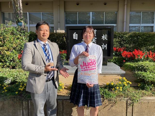 本校柔道部でスポーツ科学コース1年の山浦衣未さんが作成したポスターが11月25日(土)の石川県立武道館で開催される「Judo フェスティバル in HOKURIKU」での採用が決まりました。山浦さんは柔道未経験者ながら入部以来柔道でもめきめきと力を付けています。今回はポスターでも素晴らしい能力を発揮し、山浦さんの多才ぶりに感心しました。