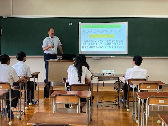 本日2限目の日本史探究の授業では金剱宮の宮司をなさっています守部さんに来て頂き、鶴来の伝統的なお祭りであるほうらい祭りを中心にお話しいただきました。同時に昨今話題になっているオーバーツーリズムについても触れて頂き、生徒達は真剣な眼差しで、有意義な時間を過ごしました。守部さんありがとうございました。