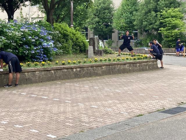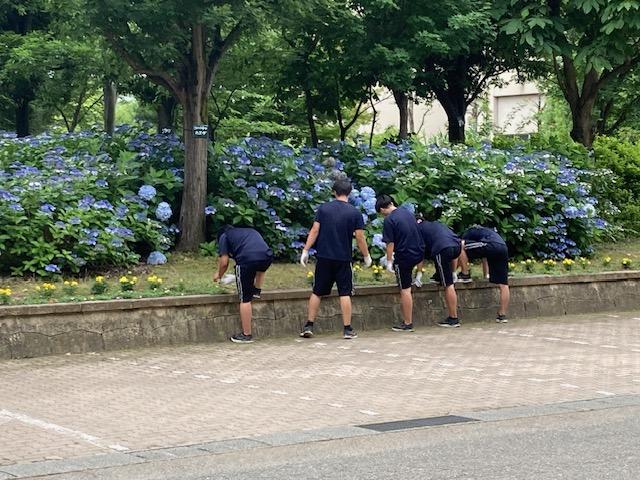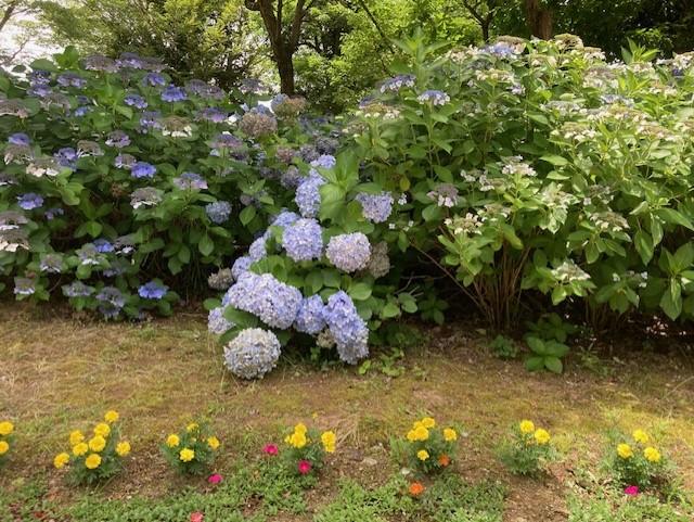 正面のアジサイが満開です。朝、夕と生徒達を見守ってくれています。今日は暑いですが、生徒の元気な声が聞こえます。来週には野球部の試合も控えています。まるでアジサイが「野球部頑張れ」と言っているみたいです。