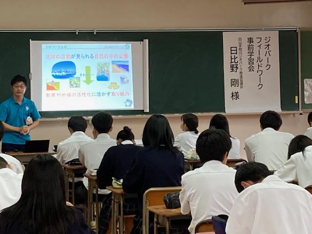 本日7限目LHの時間に、来週金曜日に2年生の地域学履修者を対象に行われますジオパークフィールドワークの事前指導が行われました。本日の事前指導には白山手取川ジオパーク推進協議会より日比野剛さんに来て頂きました。生徒達は真剣に日比野さんのお話を聞いていました。