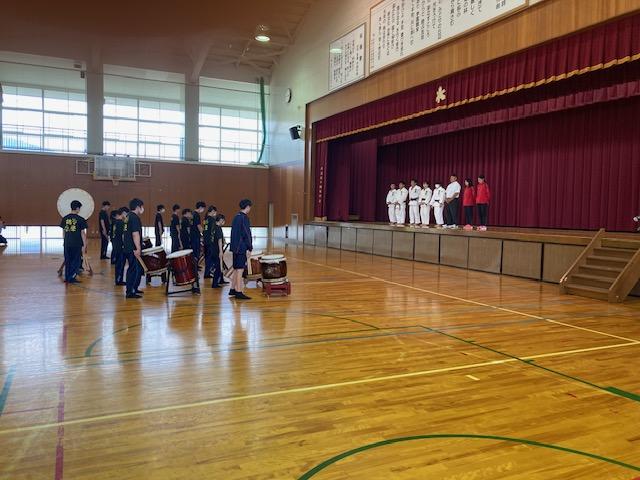 和太鼓部の激励演奏を受ける選手達