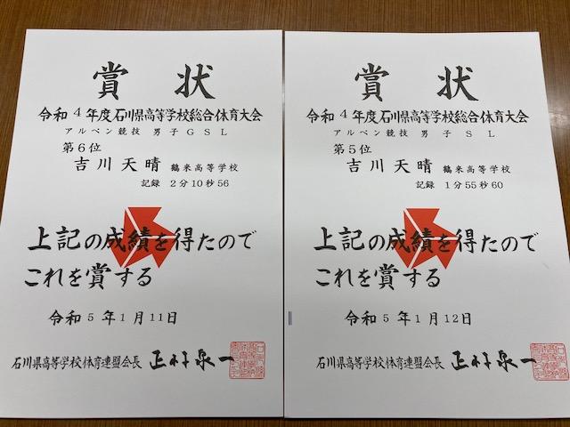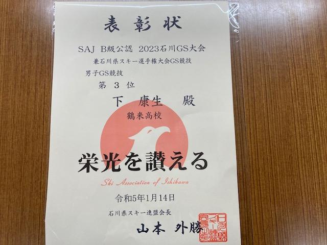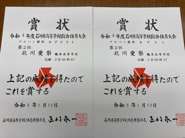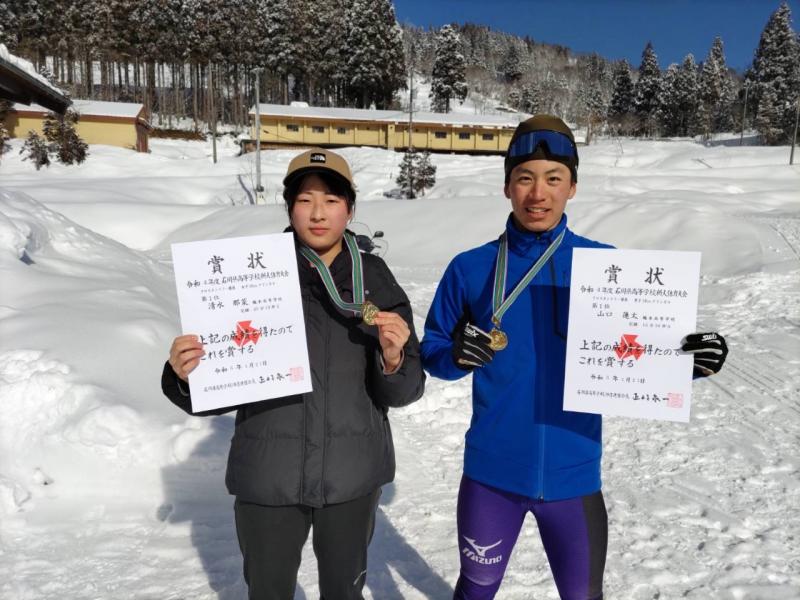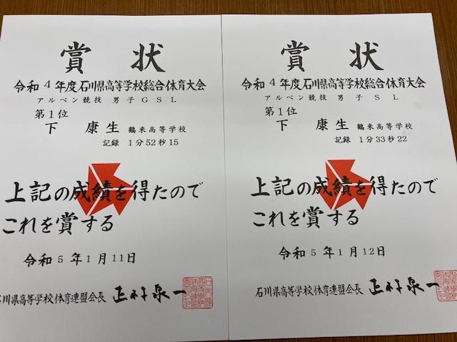 本日開催されましたスキーインターハイ予選で本校の下康生君が男子GSLで優勝、女子GSLで北川愛梨さんが2位に入賞しました。また、男子クロスカントリー競技クラシカル10Kmで山口蓮太君、女子クラシカル5Kmで清水那菜さんが優勝しました。おめでとうございます。