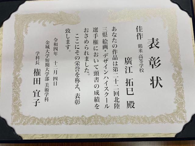 2022年12月12日 09時57分本校3年生の廣江拓巳君の作品が第22回北陸三県絵画・デザインハイスクール選手権で佳作に輝きました。おめでとうございます。
