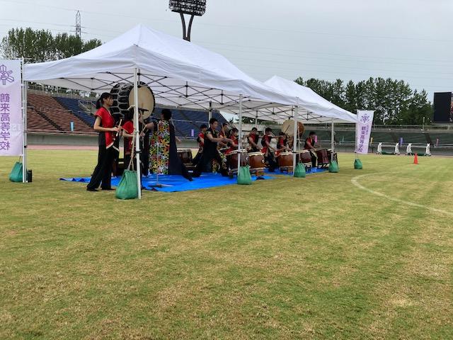 雨の中パフォーマンスを披露する和太鼓部