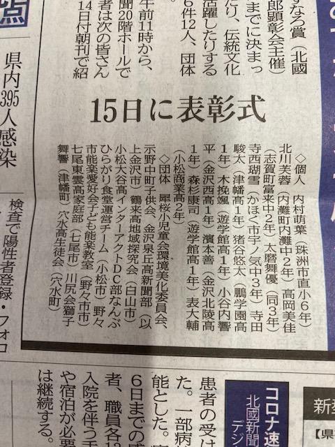 2022年10月7日 14時20分本校地域探究会が北國新聞のあすなろ賞に輝きました。日頃からの地域交流が認められました。部員達は10月21日からの第12回日本ジオパーク全国大会白山手取川大会に向けて更に活動を広げていきます。