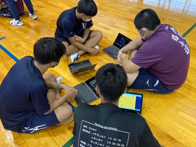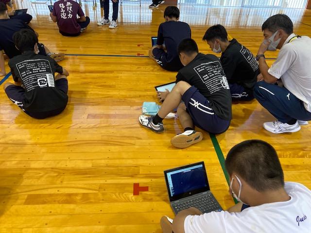 今年度より、本校でも1人1台端末が実現し、多くの授業で使われています。体育の授業でもお互いの動きを録画し見せ合って競技力の向上に努めています。