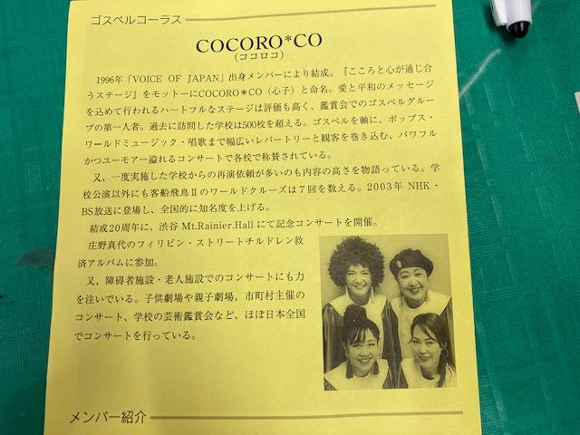 本日、3年ぶりに高文連の文化教室が開催されました。COCORO※CO(ココロコ)の皆さんのゴスペルコーラスを聴きました。生徒達もノリノリで堪能した様子でした。「誰でも心の中に小さな光を持っている」という言葉印象的でした。ココロコの皆さん、元気を与えてくれて有り難うございました。