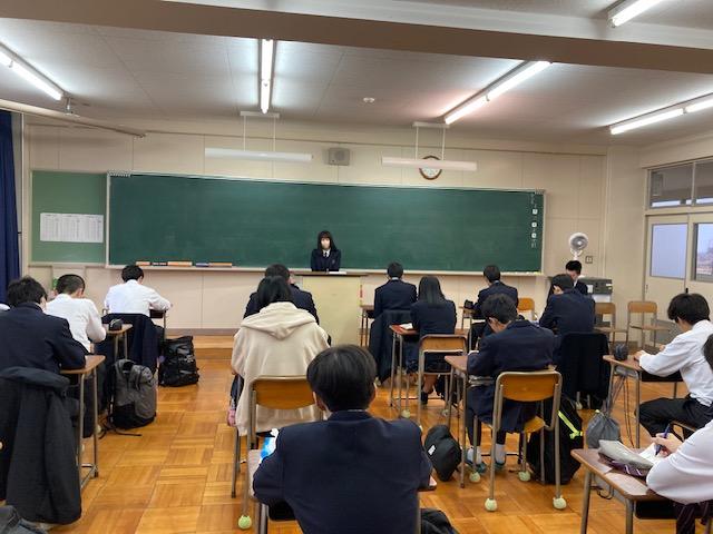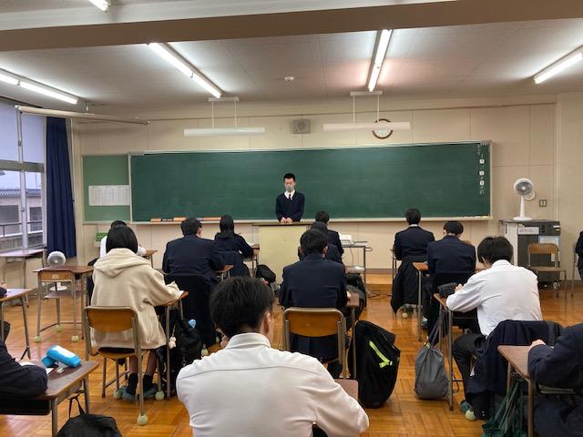 本日朝の自習時間に3年生で公立小松大学に合格した中川君と富山大学に合格した阿部さんが後輩に合格体験談を語ってくれました。志望校決定時期やモチベーションの上げ方等直ぐに役に立つ情報を提供してくれました。後輩からも面接時の質問の内容等の質問があり二人とも丁寧に答えてくれました。中川君、阿部さん、有り難うございました。
