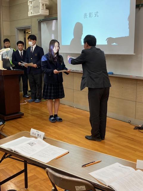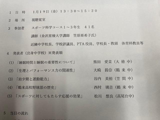 本日、3年スポーツ科学コース卒業研究発表会が実施されました。事前のクラス発表会で選ばれた5人の生徒達が十分に時間をかけた自分たちの研究を分かりやすく発表してくれました。発表後の質問にもしっかりと答え、とても落ち着いた発表でした。終了後、来賓として参加いただいた金沢星稜大学の笠原先生からもお褒めのお言葉をいただき生徒達は満足そうでした。尚、最優秀賞には柔道部の谷内美裕さんの「幼少期と運動能力」が選ばれました。発表者の皆さん、ご苦労様でした。