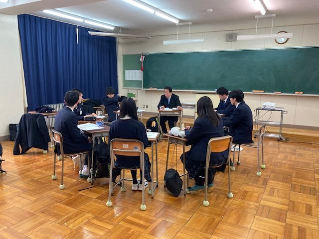 本日、白山市議会議員の方々7名が本校を訪れ、議会報告会が行われました。質問コーナーでは議員の給料等の質問もあり、最初は緊張した様子でしたが、少しずつリラックスした感じで、和やかな雰囲気で会が進行しました。白山市議の皆さん有り難うございました。