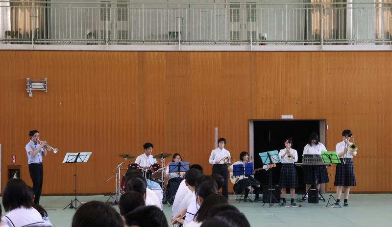 ジャズバンド部は、柔道部・ラグビー部・陸上部・弓道部の選手に向けて演奏をしました。「さくらんぼ」の演奏に合わせて、スポ科の皆さんがダンスを踊り、非常に盛り上がりました。