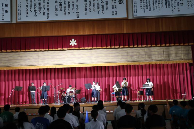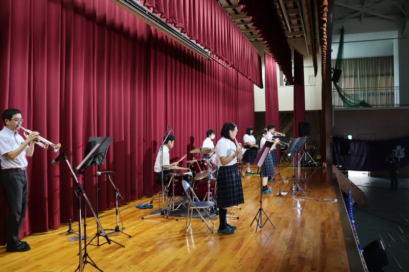 本番では「さくらんぼ」と「夏祭り」の2曲を演奏しました。全員が高校から始めた生徒たちとは思えないほど堂々とした演奏でした。特に1年生は楽器を初めて2カ月でよくやり切ったと思います。10分にも満たない演奏でしたが、楽しい時間になりました。