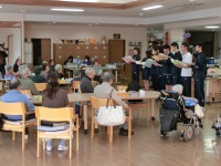 今日はあじさいの郷デイサービスへお邪魔して、訪問演奏会を行いました。はじめにパートリーダーが1人ずつ「この道」を独唱し、その後全員でわらべうた3曲(あんたがたどこさ、通りゃんせ、ずいずいずっころばし)をアカペラで、涙そうそう、島唄、糸、アンコールに残酷な天使のテーゼと計7曲歌ってきました。口ずさんでくれるお年寄りも多く、少々失敗もしていましたが楽しく歌うことができました。歌った後は音楽プログラムで一緒に踊ったり歌ったりして交流しました。このような貴重な機会を与えてくださったあじさいの郷のみなさん、ありがとうございました。