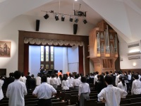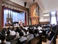 今日は北陸学院高校栄光館にて春季講習会が開催されました。講師は昨日に引き続き合唱指揮者の菅野正美先生で、混声と女声に分かれて指導をしてくださいました。本校は混声にのほうに参加し、特にバスやテナーの歌い方などを中心に丁寧に見ていただきました。大変難易度の高い楽曲でしたが、非常にわかりやすいご指導で、講習会後は生徒が何かすごく得たものがあるようなことを目をキラキラさせながら言いに来てくれました。