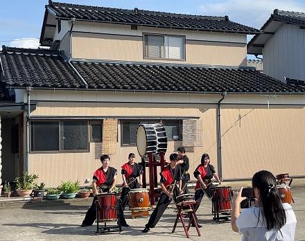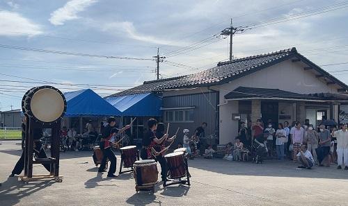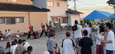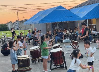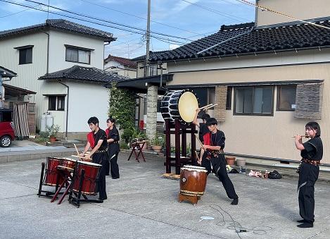 3月に卒業した前部長 服部 さんのご縁で、今年も東森島町内会夏祭りにお呼びいただきました。服部さんと現部員の計3名で演奏させていただきましたが、2名となった現部員(3年生)にとっては、本当に久しぶりの演奏でしたので、連日の暑さなど全く感じないほど、うれしさがまさるひとときとなりました。3曲お聞きいただいた後は、町内のお子様対象に「和太鼓体験」をお楽しみいただきました。たった2人になった部員は充実感みなぎった、とってもいい笑顔をしていました。東森島町内会のみなさま、本当にありがとうございました。