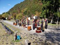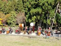 白山市吉野にある「吉野工芸の里」で演奏しました。会場ではたくさんの方々に見ていただき感謝の気持ちで一杯です。本当にありがとうございました。最後にはアンコールの声がかかり、全部で6曲演奏しました。終わった後には、「良かったよー」とか「素晴らしい!」など暖かいご声援を頂き、一生懸命に練習したかいがありました。秋晴れの素晴らしいお天気の中、色づいた山々にこだました太鼓の響きがとても印象的でした。