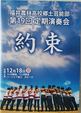 昨年の12月18日、福井農林高校郷土芸能部定期演奏会が行われました。当初は本校和太鼓部全員で見に行く予定をしていましたが、コロナ感染症拡大の影響で中止となりました。大変残念に思っていたところ、福井農林高校郷土芸能部顧問の岩本先生が、定期演奏会のDVDを作成しているのでどうでしょうか。という案内を頂き、即購入しました。
