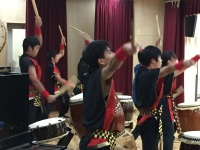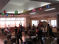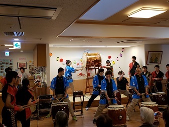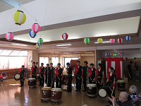 次に太鼓打ち体験をしました。入所者の方が気軽に参加し太鼓を打つ体験コーナーです。中には以前太鼓をやっていた方がいて、とっても上手に叩いていました。その後、職員の方も体験をしました。楽しそうに叩いていたのがとても印象的で、とっても盛り上がりました。